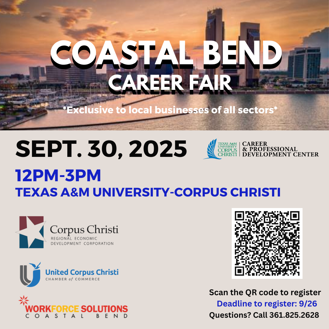 The Coastal Bend Career Fair is taking place on campus at Texas A&M University–Corpus Christi on Tuesday, September 30th, from 12:00 p.m. to 3:00 p.m. This event is exclusive to businesses in the Coastal Bend region. This recruiting event is designed to give local companies the first opportunity to connect with students and upcoming graduates across all majors at Texas A&M University–Corpus Christi.